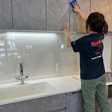 キッチン周りの壁や吊戸棚には、油はねやホコリが付着しやすい場所です。専用のクロスで丁寧に拭き上げ、見た目も清潔に整えます。