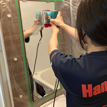 鏡の周囲をマスカーで丁寧に養生し、周辺の壁や金具に洗剤が付着しないよう保護していきます。