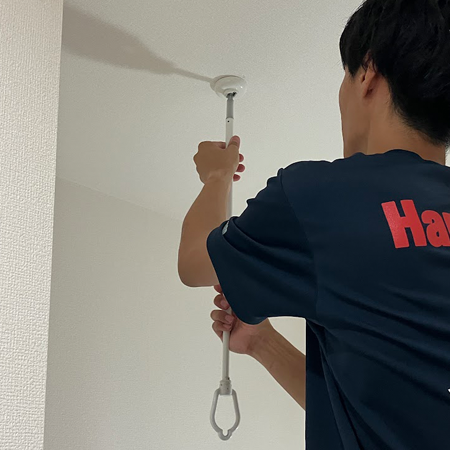 天井に取り付けるタイプの「室内用物干し器具(ホスクリーンなど)」を設置する作業です。