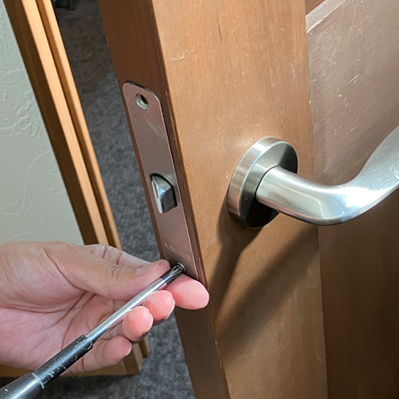 最後に正面のビスを固定して、ラッチとドアノブの動作を確認します。スムーズに開閉できるか、ぐらつきがないかを点検し、作業完了です。
