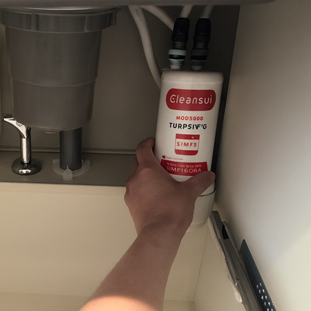 キッチンに取り付けられている浄水器のカートリッジを、新しいものに交換する作業です。