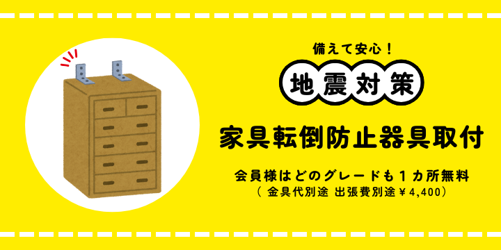 倒れやすいタンスや食器棚、本棚などに転倒防止金具を設置しませんか?