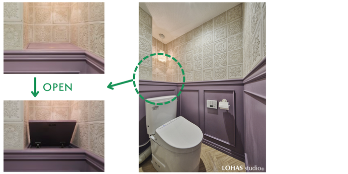 トイレの後ろ側にある配管スペースのちょっとした隙間を活用して、トイレットペーパーなどを収納できるようになっています。フタには全回転取っ手が付いており、取っ手を使わない時には水平にできるので、フタの上に物を置くこともできます。