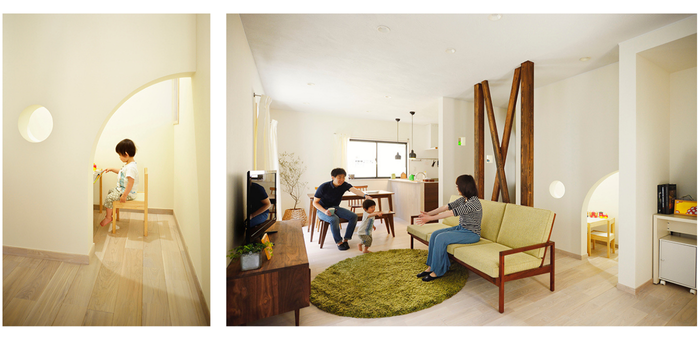 アーチの下がり壁がLDKとキッズコーナーを優しく仕切り、LDKの雰囲気にも馴染むので、気兼ねなくゲストも呼べます。お子さんの様子を見守れる丸い窓も、遊び心があって楽しいつくりとなりました。