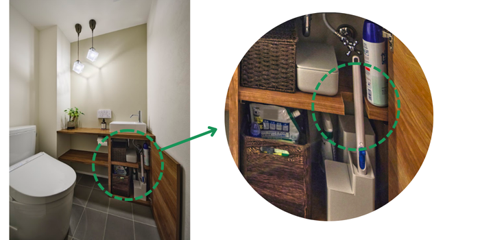 こちらの収納棚には2段目の台をトイレブラシがぴったりフィットするように、カットされているので縦長の道具でもすっきり収納することができます。